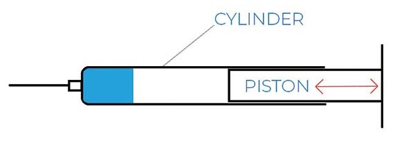 向后拉注射器的活塞會產(chǎn)生吸力,將液體拉入氣缸,同時向前推動活塞將液體通過注射器的推頭排出(圖 1)。